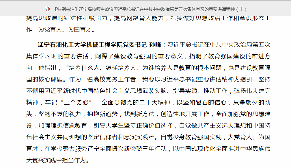 编者按:6月10日,辽宁高校思政微信公众号以《辽宁高校师生热议习近平总书记在中共中央政治局第五次集体学习的重要讲话精神(十)》为题,组稿刊登了我校机械工程学院党委书记孙峰的感悟。现将相关报道转载如下: