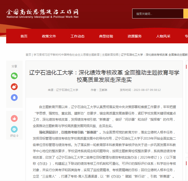 编者按:近日,全国高校思想政治工作网、人民日报客户端·人民号等媒体平台对我校认真贯彻落实党中央决策部署和省委工作要求,牢牢把握“学思想、强党性、重实践、建新功”总要求,锚定高质量发展首要任务,紧盯学校发展关键领域重点工作,深化绩效考核改革,发挥绩效考核引航“新赛道”、做好“问诊器”和当好“指挥棒”的作用,全面推动主题教育与学校高质量发展同频共振、走深走实进行了宣传报道。现将相关报道转载如下: