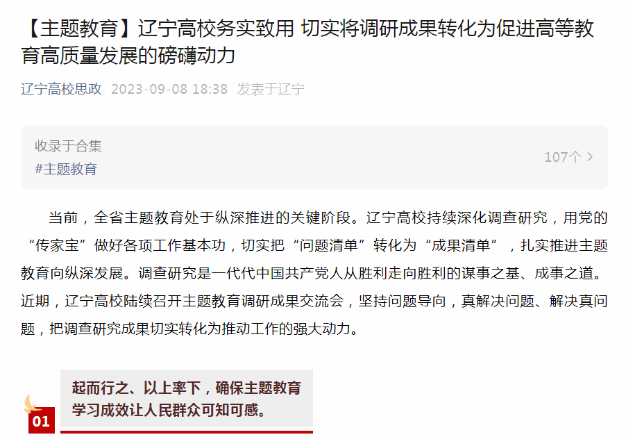 编者按:近日,辽宁高校持续深化调查研究,用党的“传家宝”做好各项工作基本功,切实把“问题清单”转化为“成果清单”,扎实推进主题教育向纵深发展。辽宁高校对此进行了宣传,其中对我校开展实地走访调研258批次,汇总梳理出64个方面的问题,提出整改措施67个,形成调研成果62个,撰写完成10篇领题调研报告、12篇专项调研报告以及1篇正面典型案例报告、1篇反面典型案例报告作了报道。现将相关报道转载如下: