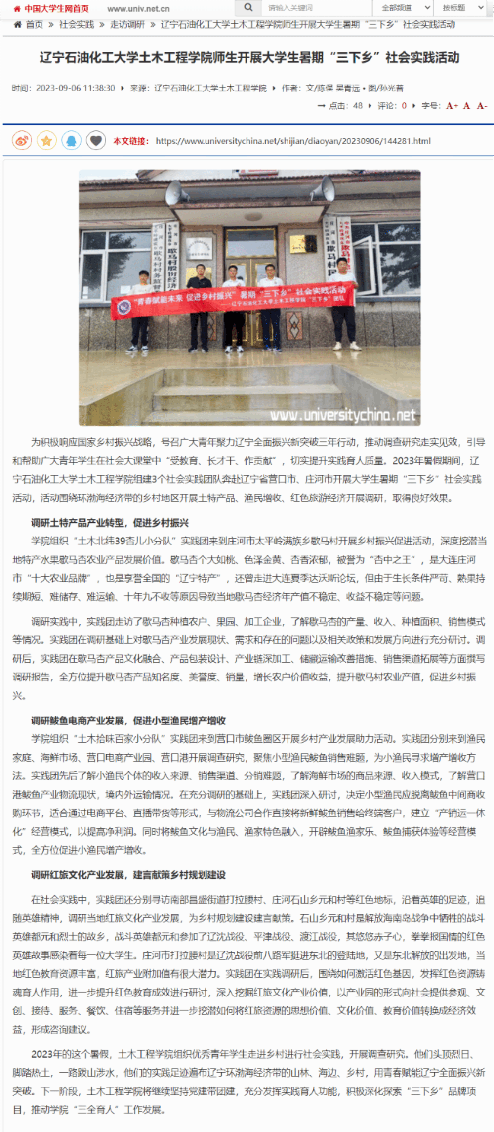 编者按:近日,中国大学生网、人民日报客户端·人民号、辽宁日报·北国号等媒体平台对我校土木工程学院师生开展大学生暑期“三下乡”社会实践活动进行了宣传报道。现将相关报道转载如下: