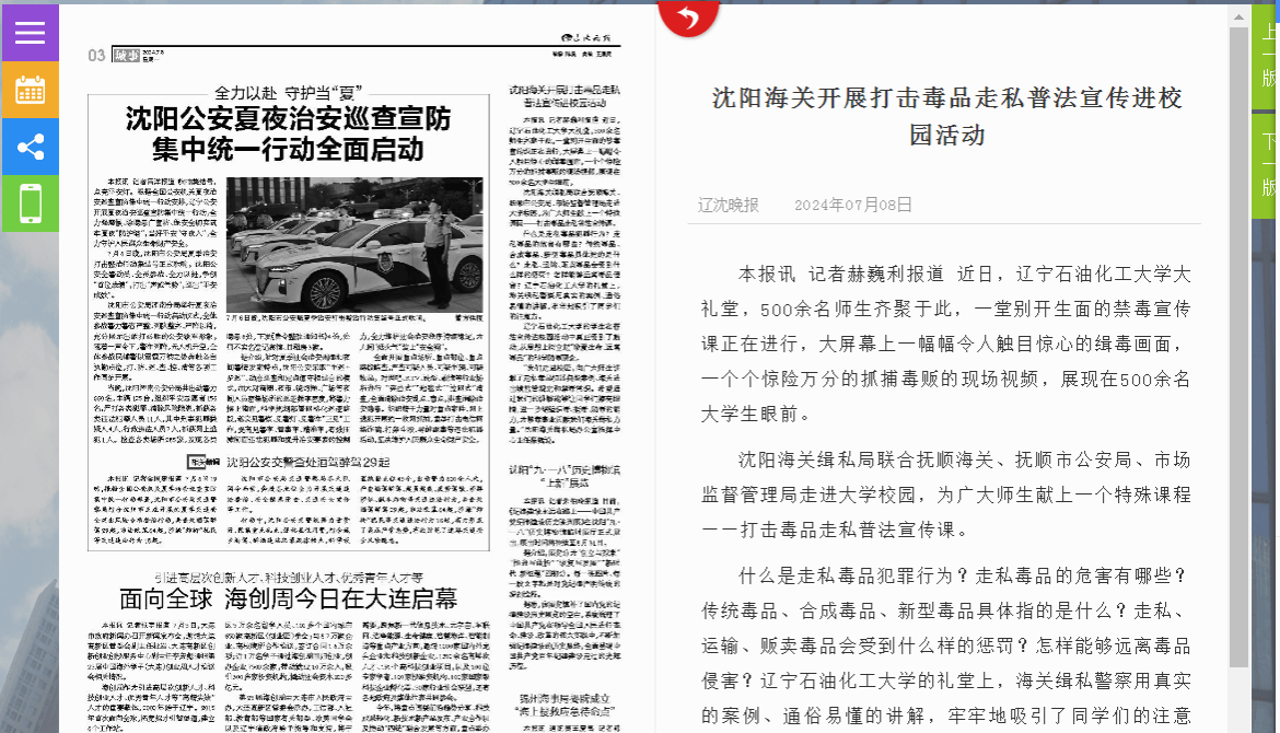 编者按:7月8日,辽沈晚报第3版以《沈阳海关开展打击毒品走私普法宣传进校园活动》为题,对沈阳海关缉私局联合抚顺海关、抚顺市公安局、市场监督管理局走进我校,为500余名师生开展打击毒品走私普法宣传课进行了宣传报道。现将相关报道转载如下: