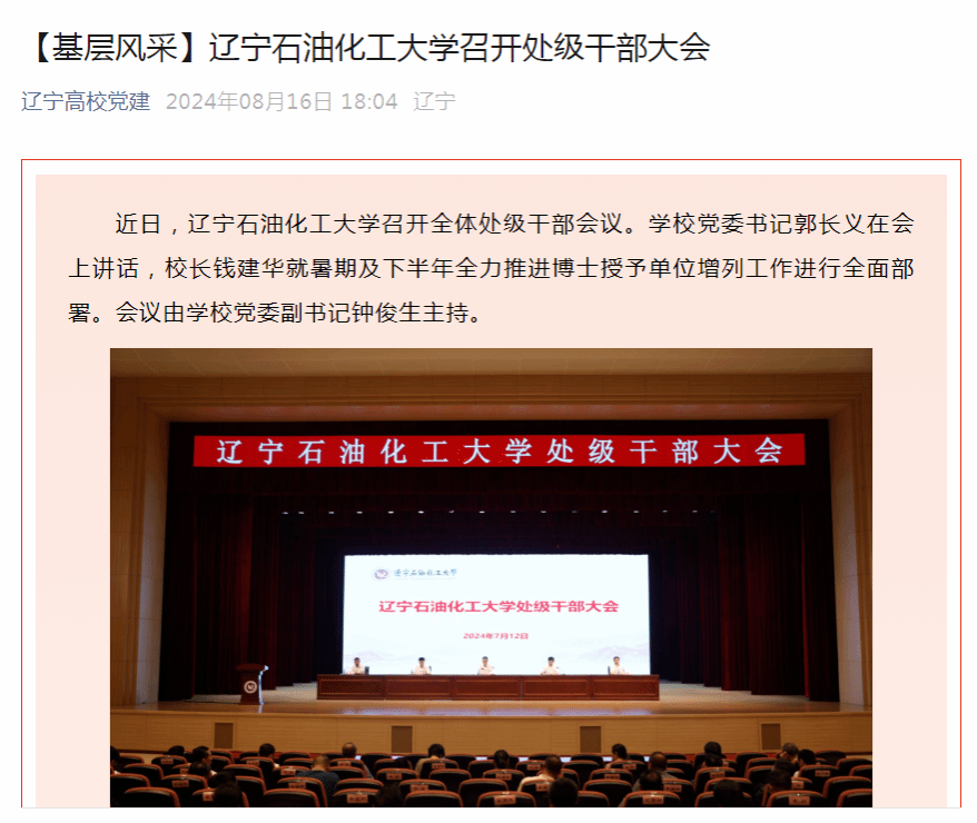 编者按:近日,学校召开全体处级干部会议,校党委书记郭长义在会上讲话,校长钱建华就暑期及下半年全力推进博士授予单位增列工作进行全面部署。辽宁高校党建微信公众号对对其进行了宣传报道。现将相关报道转载如下: