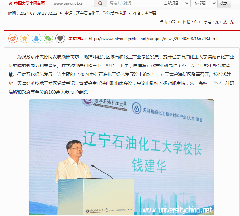 编者按:8月8日,辽宁日报·辽望号、搜狐号、中国大学生网对滨海石化产业研究院主办,以“汇聚中外专家智慧、促进石化绿色发展”为主题的“2024中外石油化工绿色发展院士论坛”,在天津滨海新区隆重召开进行了宣传报道。现将相关报道转载如下: