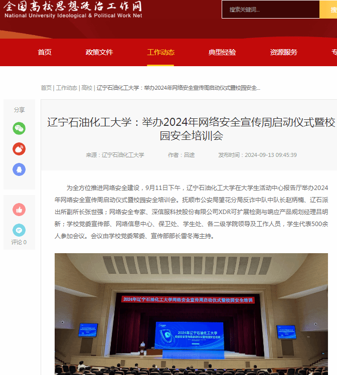 编者按:9月11日下午,学校在大学生活动中心报告厅举办2024年网络安全宣传周启动仪式暨校园安全培训会。全国高校思想政治工作网、教育部中国大学生在线网、中国大学生网、搜狐号等对此进行了宣传报道。现将相关报道转载如下: