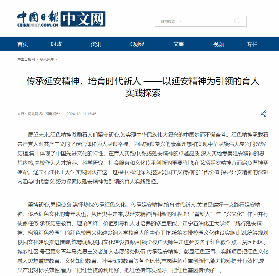 编者按:近日,中国网、中国日报网、中国经济网、中华网等网站对我校体育学院石晶老师撰写的文章《传承延安精神,培育时代新人 ——以延安精神为引领的育人实践探索》进行了宣传报道。现将相关报道转载如下: