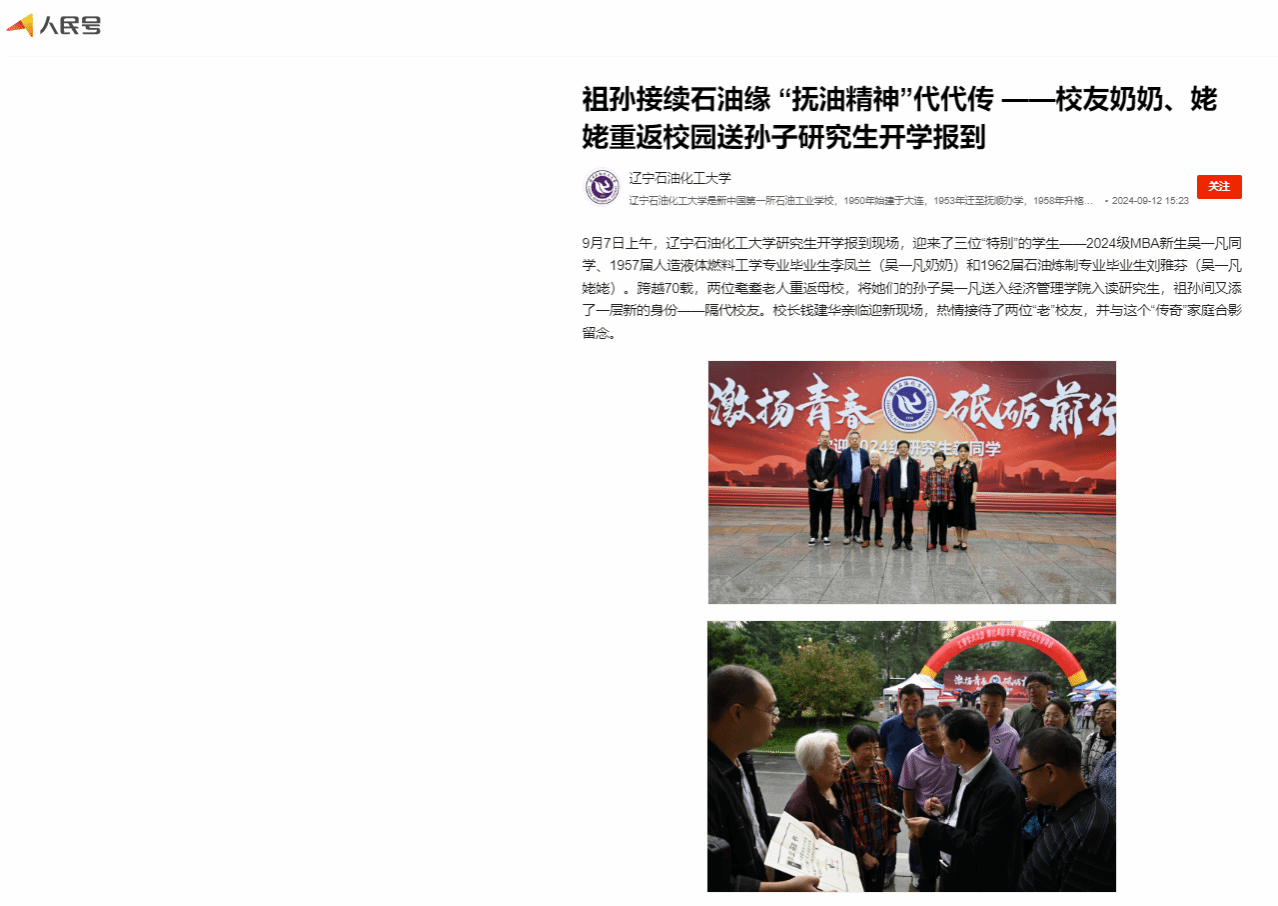 编者按:国产亚洲综合一区二区三区_亚洲欧美日韩中文天堂_尤物在线观看视频不卡无码_国产最新精品亚洲2025不卡_亚洲成Av人在线观看片水蜜桃研究生开学报到现场,迎来了三位“特别”的学生——2024级MBA新生吴一凡同学、1957届人造液体燃料工学专业毕业生李凤兰(吴一凡奶奶)和1962届石油炼制专业毕业生刘雅芬(吴一凡姥姥)。跨越70载,两位耄耋老人重返母校,将她们的孙子吴一凡送入经济管理学院就读研究生,祖孙间又添了一层新的身份——隔代校友。校长钱建华亲临迎新现场,热情接待了两位“老”校友,并与这个“传奇”家庭合影留念。中国大学生网、人民日报客户端•人民号、搜狐号对此进行了宣传报道。现将相关报道转载如下: