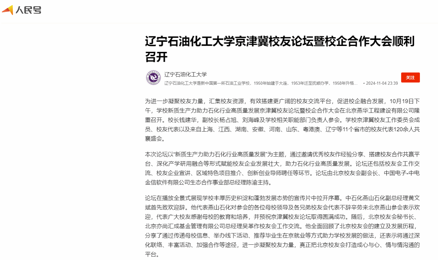编者按:为进一步凝聚校友力量,汇集校友资源,有效搭建更广阔的校友交流平台,促进校企融合发展,10月19日下午,学校新质生产力助力石化行业高质量发展京津冀校友论坛暨校企合作大会在北京燕华工程建设有限公司隆重召开。人民日报客户端•人民号、辽宁日报•辽望号对此进行了宣传报道。现将相关报道转载如下: