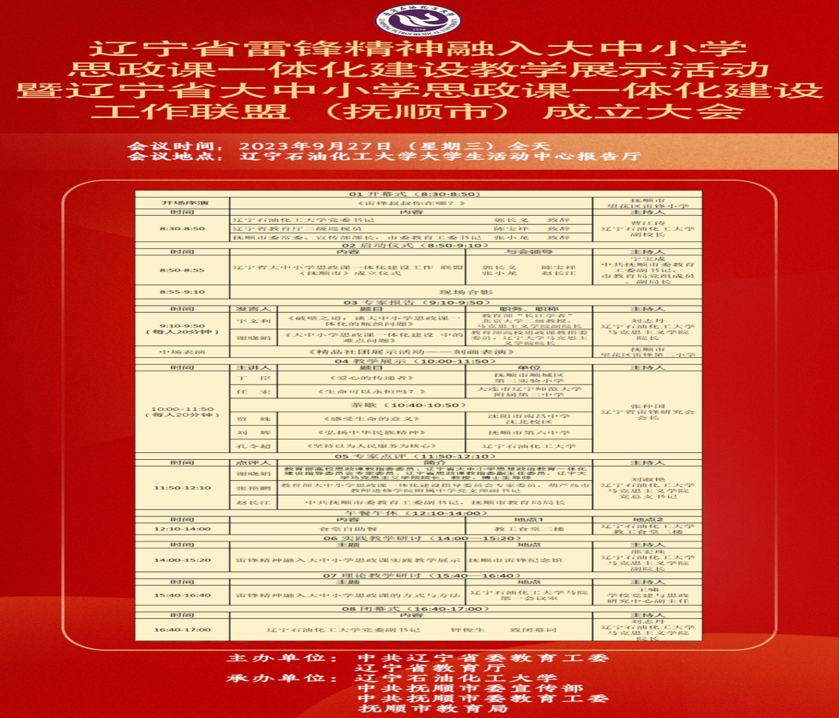 为纪念毛泽东等老一辈无产阶级革命家为雷锋同志题词60周年、习近平总书记在抚顺雷锋纪念馆发表“9.28”重要讲话5周年,深入贯彻习近平总书记关于把统筹推进大中小学思政课一体化建设作为一项重要工程的重要指示精神,学校将举办“辽宁省大中小学思政课一体化建设工作联盟(抚顺市)成立大会”暨辽宁省雷锋精神融入大中小学思政课一体化建设教学展示活动。
